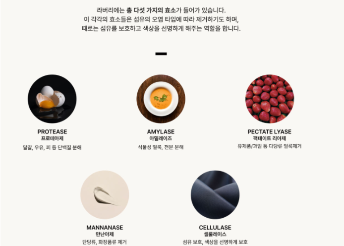 위처럼 화학적인 성분이 아닌 효소들이 들어가 친환경적이고 성능이 좋아요 또한 오염 제거하는데 있어서 섬유를 보호해주는 역할을 해줍니다.