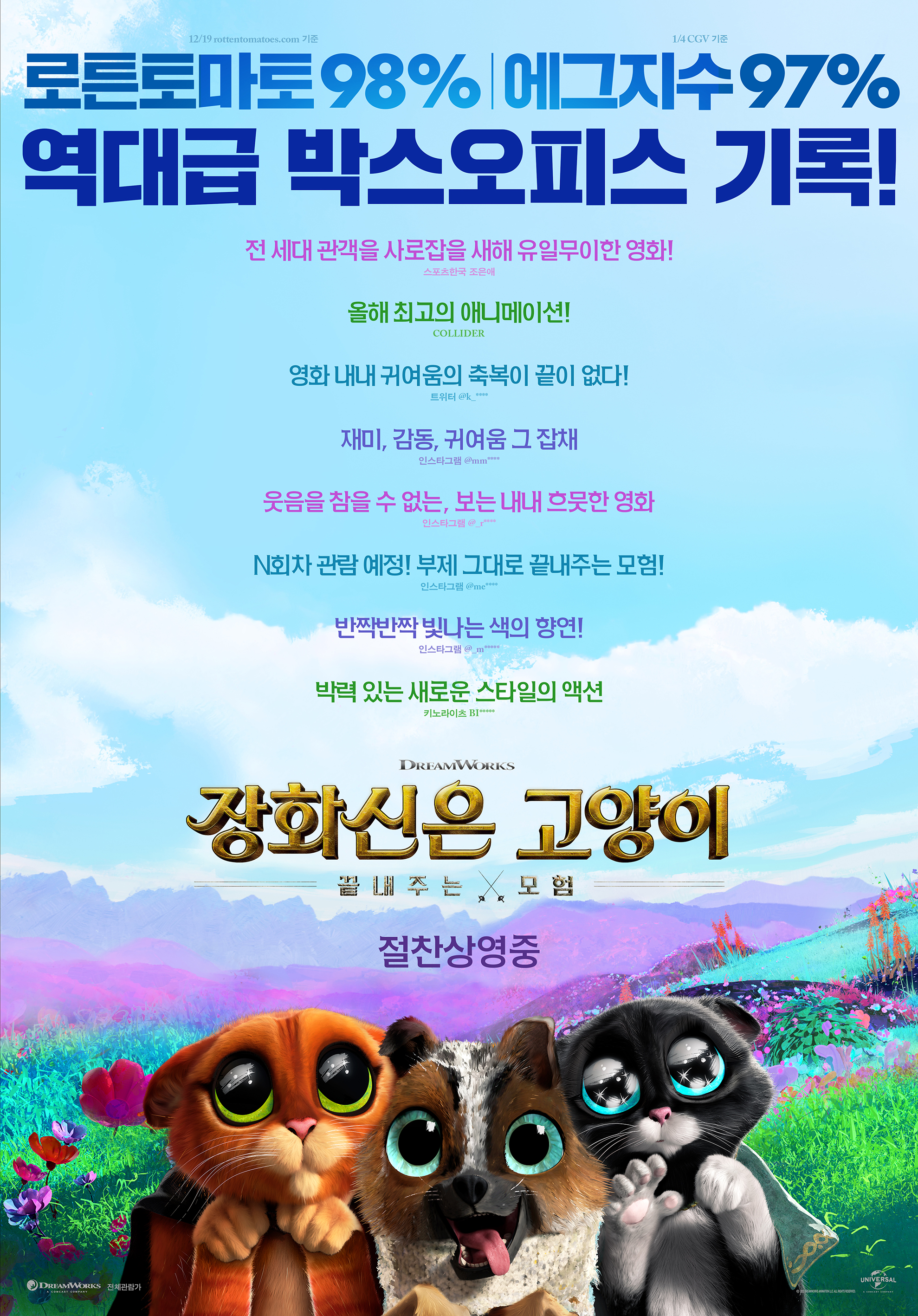 로튼토마토 관객지수 98%, 신선도지수 97%(12/19(월) 기준)를 기록하며 올 연말 최고의 애니메이션으로 손꼽히고 있는 영화 <장화신은 고양이: 끝내주는 모험>은 9개의 목숨 중 단 하나의 목숨만 남은 마성의 히어로 ‘장화신은 고양이’가 잃어버린 목숨을 찾기 위해 소원별을 찾아 떠나는 끝내주는 모험을 떠나는 ‘장화신은 고양이’가 새로운 팀을 꾸려 8번의 삶 동안 해 보지 못한 색다른 경험을 선보여 완전히 새로운 모험의 세계로 관객들을 인도할 것을 예고해 기대를 모으고 있다. 특히 동화적인 느낌을 물씬 느낄 수 있는 스토리를 기반으로 트렌디한 연출과 유머러스한 디테일이 더해진 것은 물론, 전편과는 비교할 수 없는 스케일의 화려한 볼거리 역시 눈을 즐겁게 할 예정이다. 예고편만으로도 느껴지는 캐릭터들의 팀 케미스트리, 다양한 볼거리, 다이내믹한 액션까지 다시 돌아온 ‘장화신은 고양이’가 선보일 업그레이드된 액션 어드벤처는 제약 없는 즐거움을 선사할 것이다.